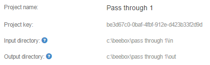 When viewing this block, you can see the unique project ID (key) and locations of the IN and OUT directories on disk. The key is assigned by the Beebox upon project creation. Disk locations can be selected when creating a project but cannot be changed thereafter.
