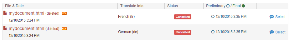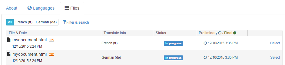 In the following example, file "mydocument.html" had been added to the project for translation into French and German.