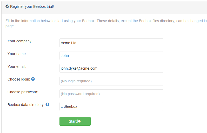If this is the first time you install the software, you will be asked to register for a 30 days trial. If you are upgrading the software, then the Beebox finds back the previous license information and registration is skipped. Fill in the registration screen: