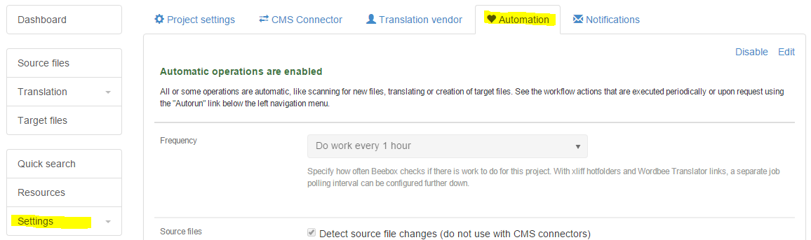 The Automation features of Beebox are among the most exciting. While you can control each translation workflow step manually with the user interface, you can also automate some or even all operations. This includes operations such as detecting new source file, machine translation, creating new human translation jobs, exchanging jobs with translators or a TMS and creation of translated files.