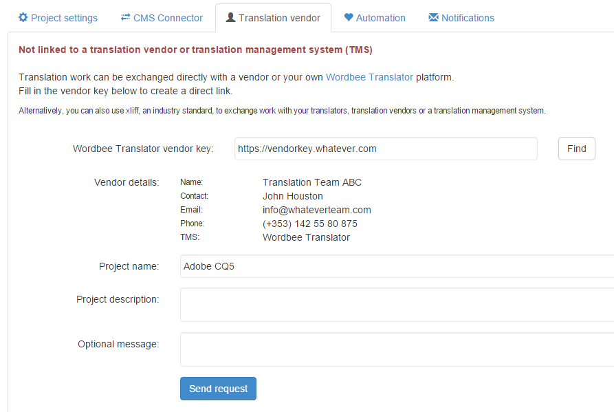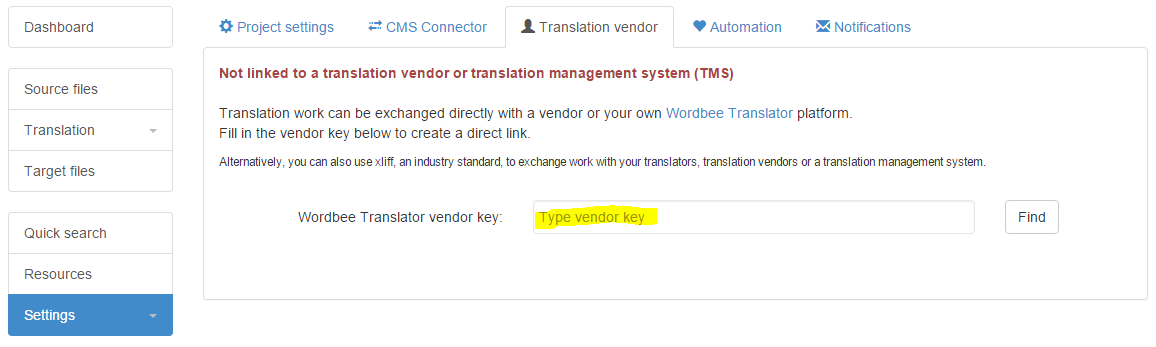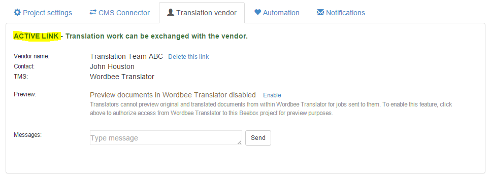 On the 'Translation vendor' page, you can link a Beebox project to a Wordbee Translator platform. Beebox jobs can then be directly sent to the platform. You might own your own Wordbee Translator platform or want to link to the platform of your preferred translation vendor.