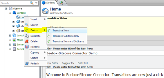 The Wordbee Beebox Connector for Sitecore makes managing multi-language content an efficient and user-friendly process. The Connector lets you filter and select content for translation, send content to your translation team or provider, receive finished translations back and have Sitecore sites updated with a click.