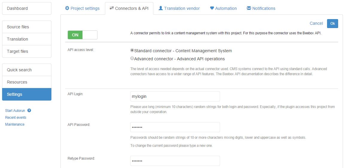 Gives access to all API methods needed to send content for translation, get cost quotations, obtain translation status and retrieve translated content. These methods are perfect for most integration scenarios, including developing CMS connectors. The login/password are assigned individually per Beebox project. When connecting to the API, you can exclusively interact with data from this project.