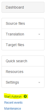 Start Autorun is among the most frequently used features in the Beebox. It executes all enabled automatic operations such as the detection of new source files, the extraction of translatable content, machine translation creation of jobs and other actions you have automated. If you are not yet aware how automation works, please read this page.
