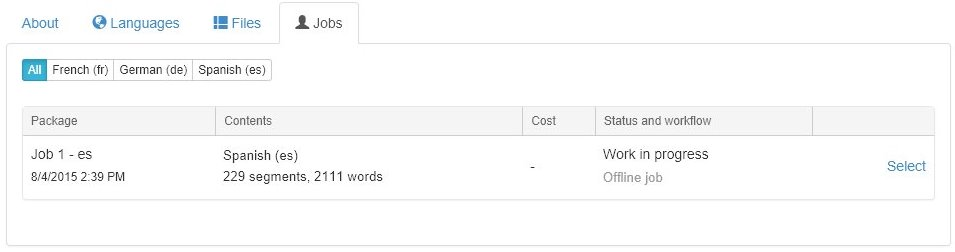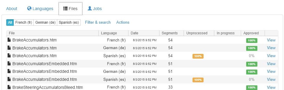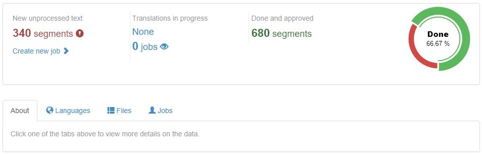 This page shows how many segments are translated, in translation or not yet assigned to translation jobs. There are tabs in the lower part to view status by language or by source file and to display all open or closed human translation jobs.