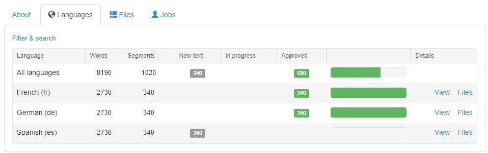 Shows translation statistics per each language: