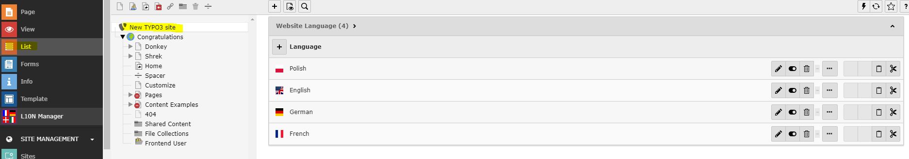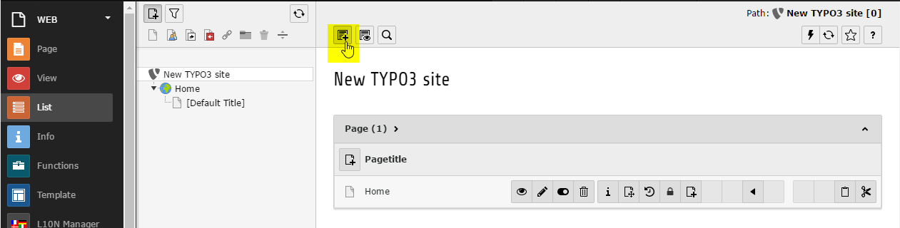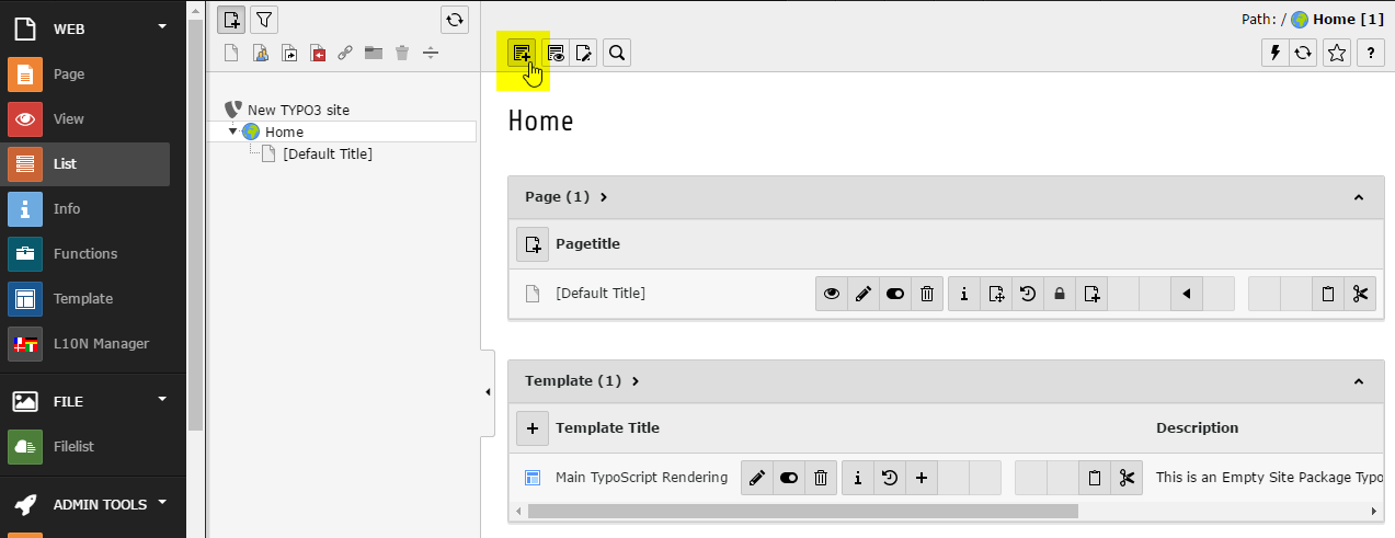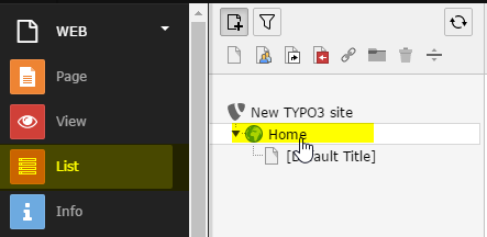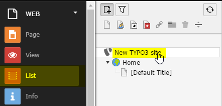 - Select List in the sidebar, and select the root module (New TYPO3 site in our example).