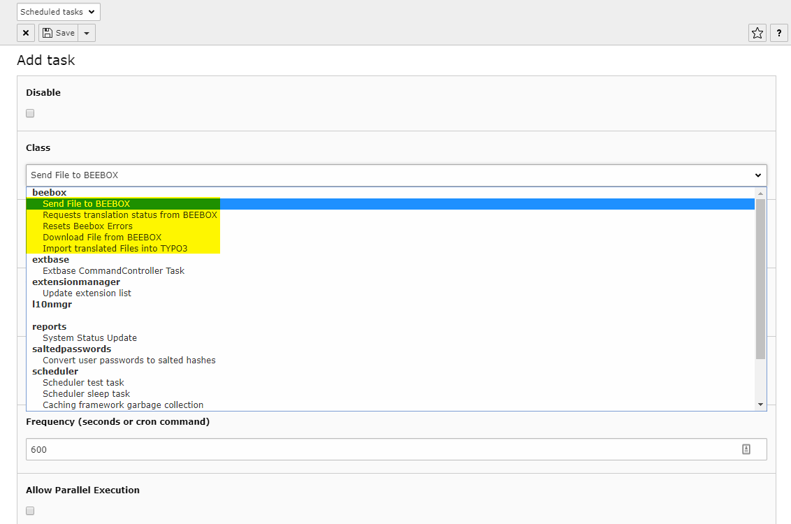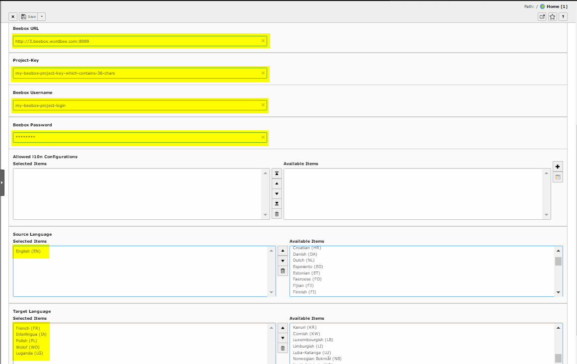 All the configurations of the TYPO3 connector are located in the Wordbee Beebox section.
