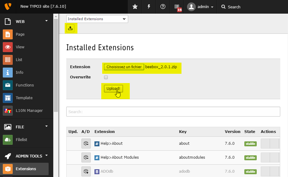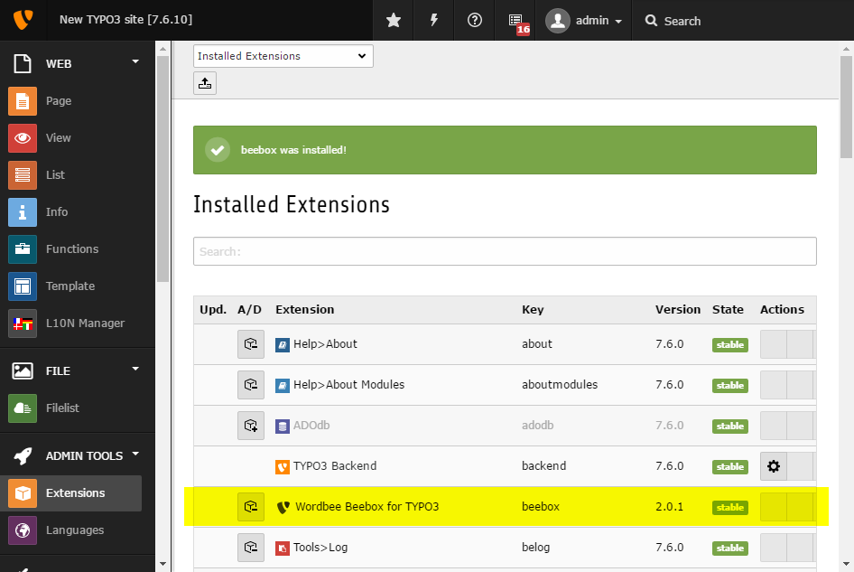 In order to make sure the installation is correct, please check your TYPO3 extensions list if it contains the Wordbee Beebox for TYPO3 extension: