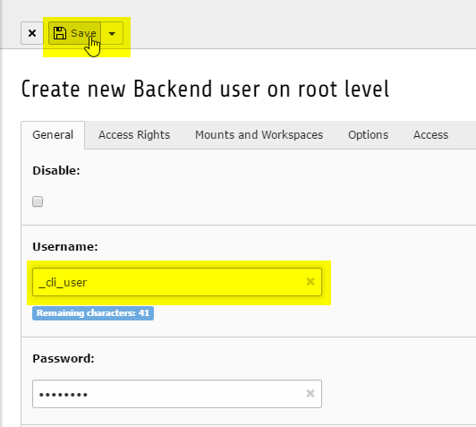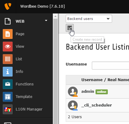 In TYPO 3 version 8, this user is named _cli_ and exists by default. - If it doesn't exist, click to the "Create a new record" button