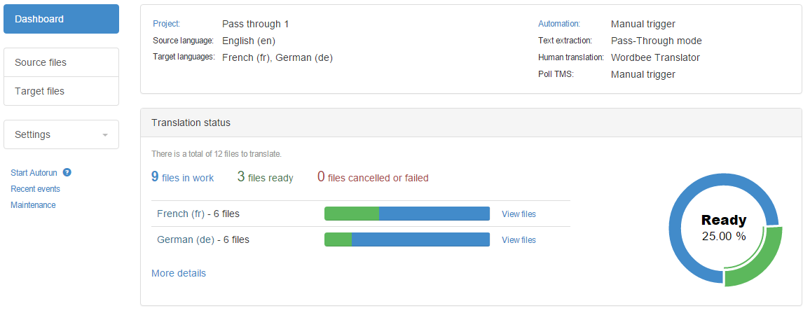 Transfer new or changed source files ("in" directory) directly to a Wordbee Translator platform.