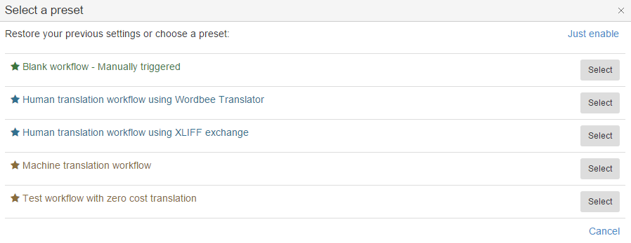 | XLIFF Hotfolders | This workflow hands off translation work to other TMS than Wordbee Translator. The Beebox implements a hotfolder mechanism to exchange XLIFF files with a TMS or for manual pickup. There are two hotfolders "OUT" and "IN". The Beebox saves all content to translate to the "OUT" folder. A TMS or person retrieves and translates the files. The translated XLIFF are then to be saved to the "IN" folder. The Beebox automatically reads out those files and ensures that translated content flows back to the CMS. Use this workflow if you use other TMS than Wordbee Translator for translation. |