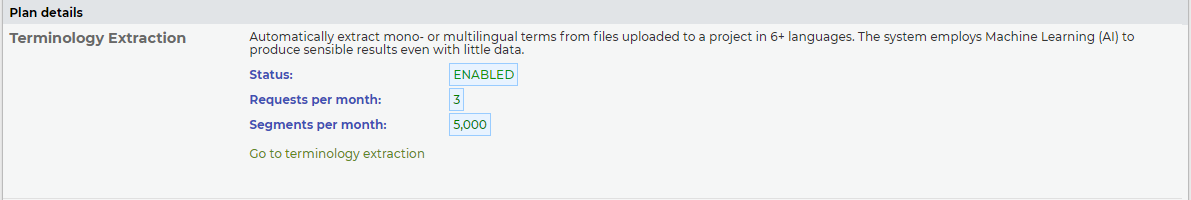 Go to Details and open the Terminology Extraction tab to see its status and the credit available.