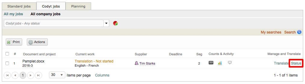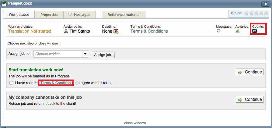 ![]() | See the word count and pricing details for your job. The breakdown of words by category will be presented, total costs may be available. In the case of a job proposal, the details about the pricing are located in the ‘Terms and Conditions’ page, available under the ‘Status popup’ for the job (read below). |