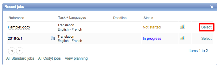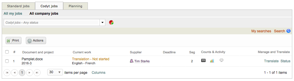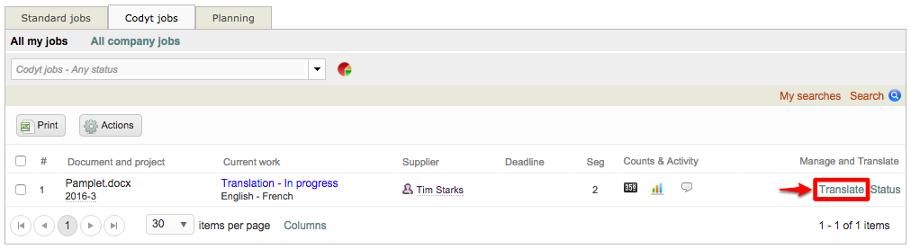 To open the job in the CAT Tool Editor, click on Translate on the CoDyt Jobs page once you have accepted the job (the translation status has been automatically set to In progress in the Current work column).