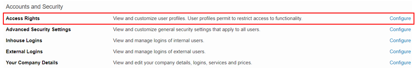 Scroll down until you see the Accounts and Security section and then click on Configure located to the right of Access Rights within this section of the screen.