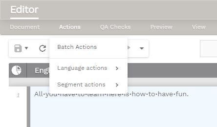 By accessing the Actions tab users gain access to Batch Actions as well as Language and Segment Actions in the Translation Editor. All actions will only have an impact on currently filtered segments. If no filter is enabled the action will be applied to all segments.