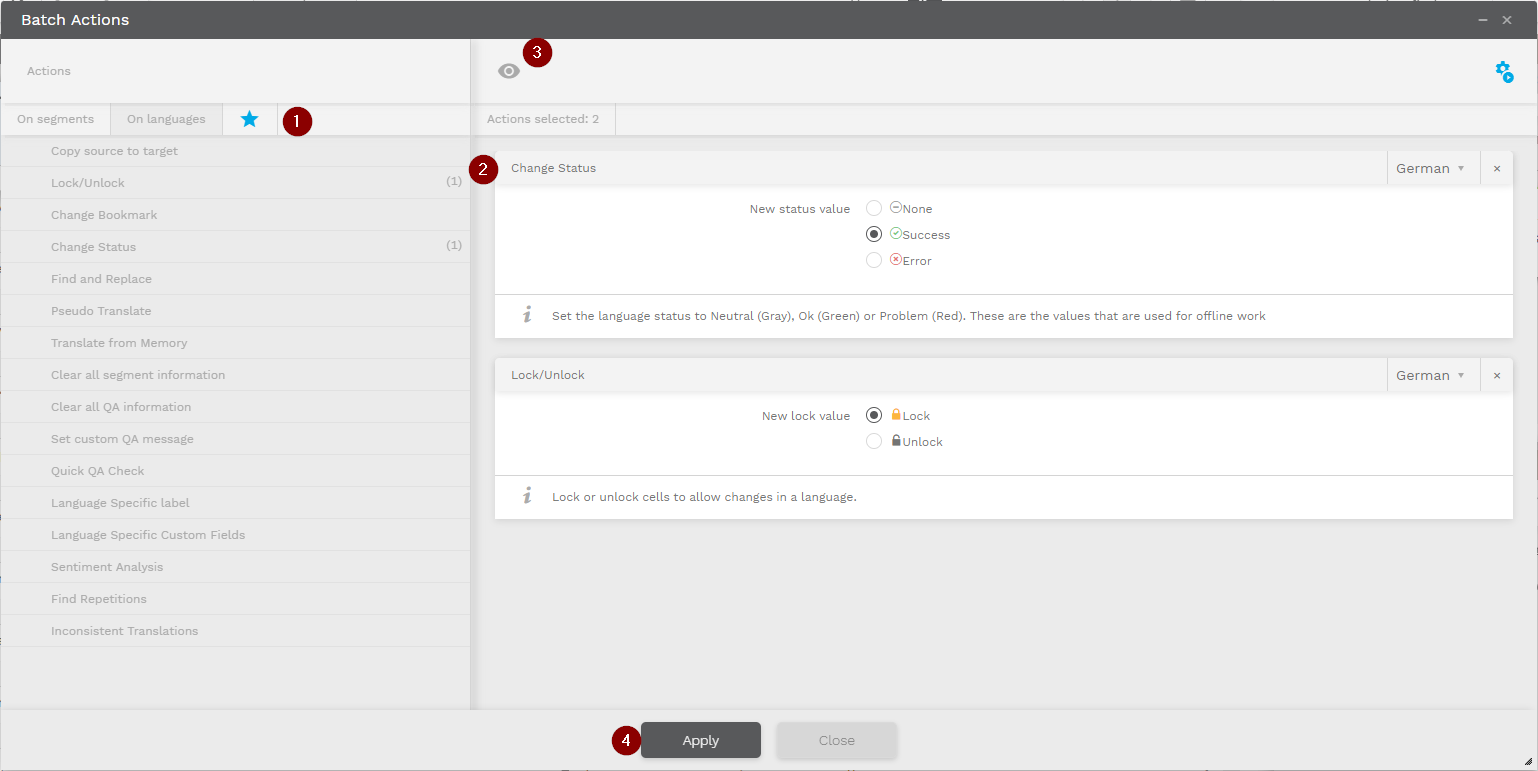 By opening the Batch Actions window users can configure several Language and Segment Actions that are to be run simultaneously on all filtered segments.