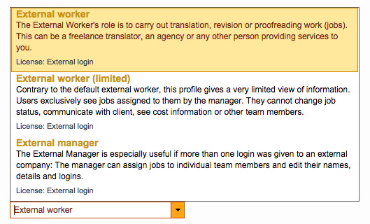 - External worker: The External Worker's role is to carry out translation, revision or proofreading work (jobs). This can be a freelance translator, an agency or any other person providing services to you.
