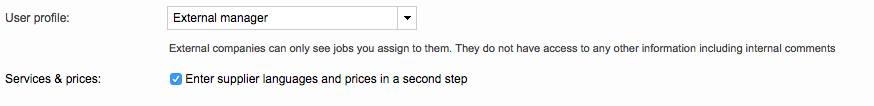 - External manager: The External Manager is especially useful if more than one login was given to an external company: The manager can assign jobs to individual team members and edit their names, details and logins.