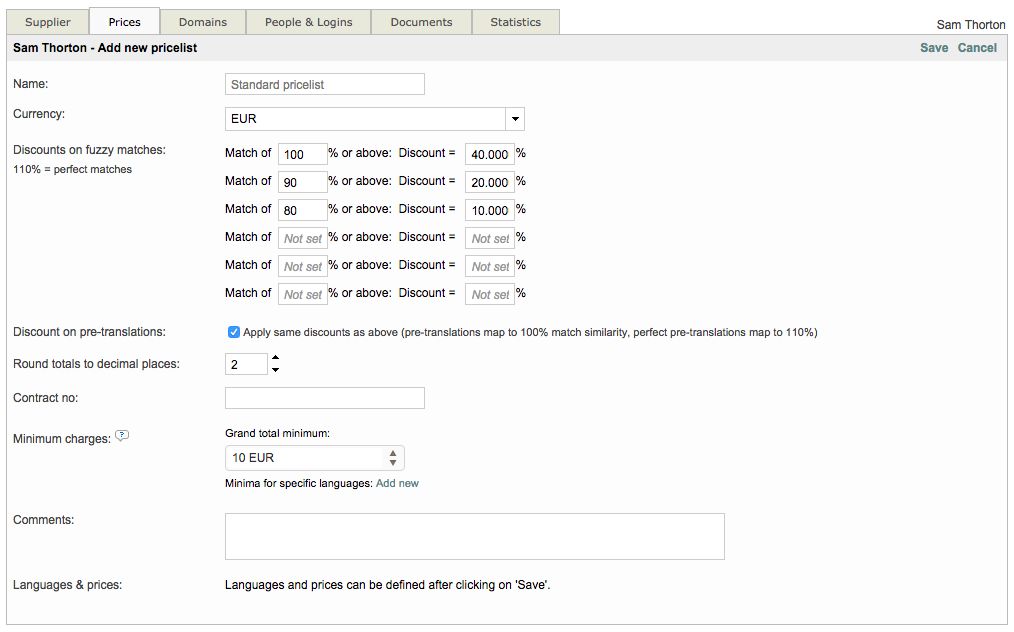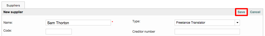 Finally, click on Save to save the supplier in the system and begin entering the supplier's languages and prices.