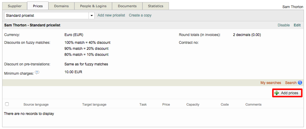 Once you have finished, click on Add new to add this information to the supplier pricing. You may follow the same steps to save additional pricing information if the supplier can complete multiple types of tasks for instance. The pricing information will appear as shown below:
