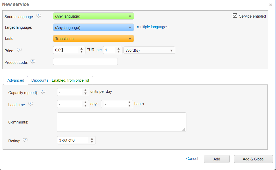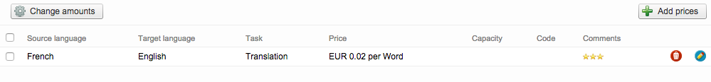 By adding pricing information, you inform the system of negotiated prices with the supplier based on a language pair and task.