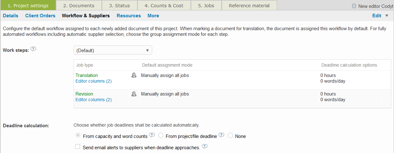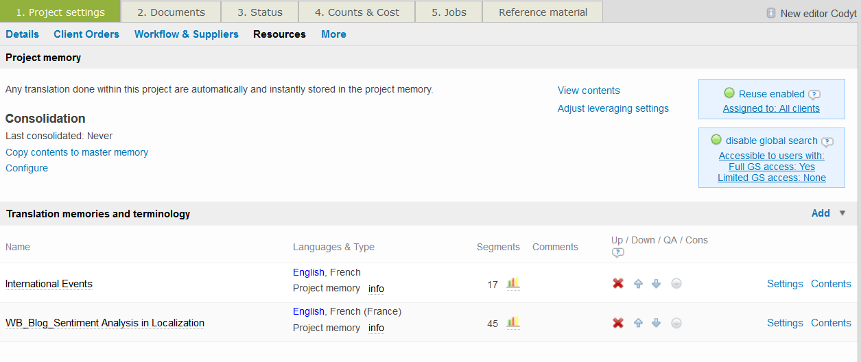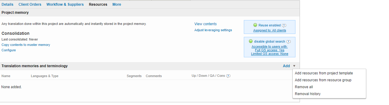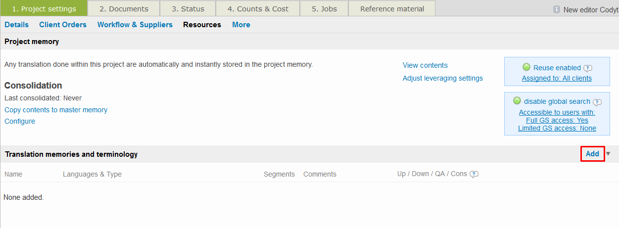 To add linguistic resources to the project, click on the Resources submenu and then click on Add to configure any needed linguistic resources (translation memories, glossaries, etc.) for your work.