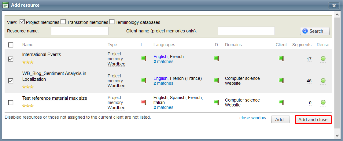 Once you have clicked on Add, select the resource(s) you need by ticking the appropriate checkboxes. Once finished, click on Add or Add and close.