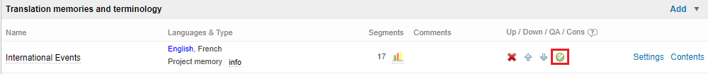 The quality assurance icon (grey/green disc) can be switched on or off. If enabled, the resource will be used by the Terminology Check QA rule. This rule verifies that translations are consistent with the attached terminology databases. For more information about the Terminology Check, go to QA Categories.