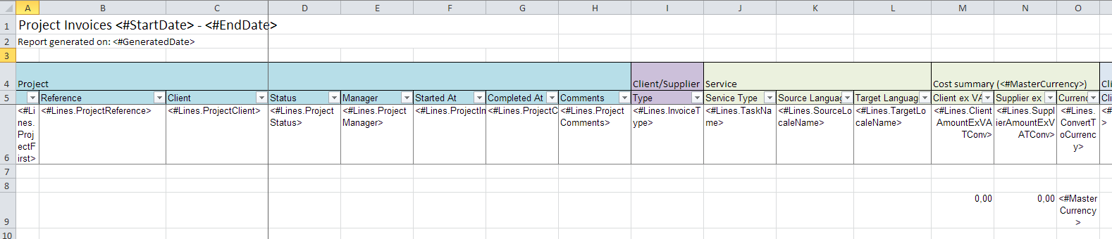 The template looks much as the final report but without the data. Instead, it includes "placeholders" that define which data field shall be inserted in which place. Excel line #6 will be repeated for each row of data.