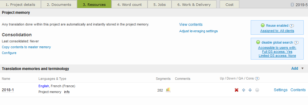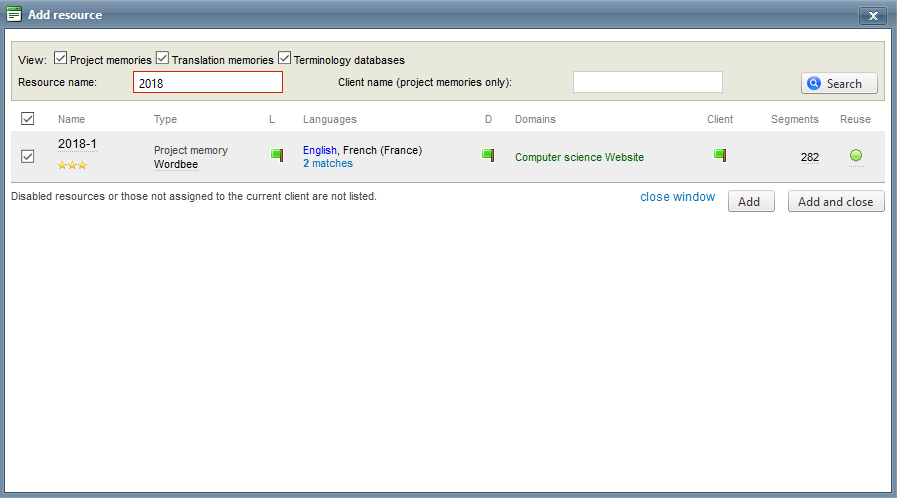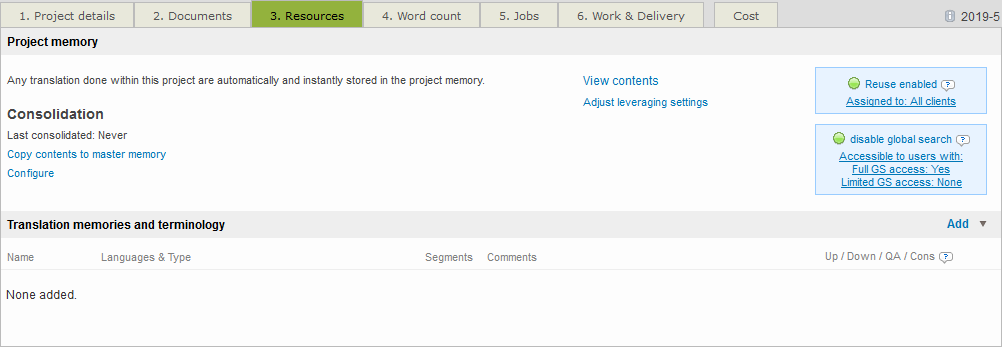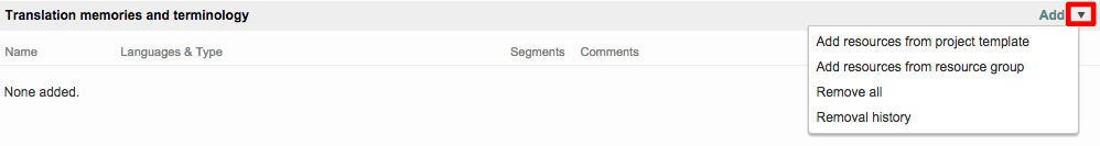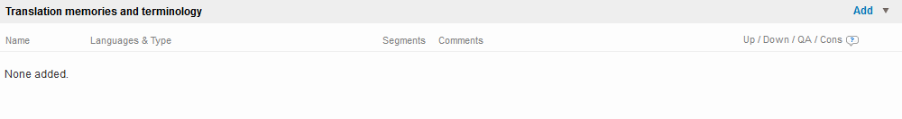 On the Resources Tab, click on Add in the Translation Memories and Terminology section.