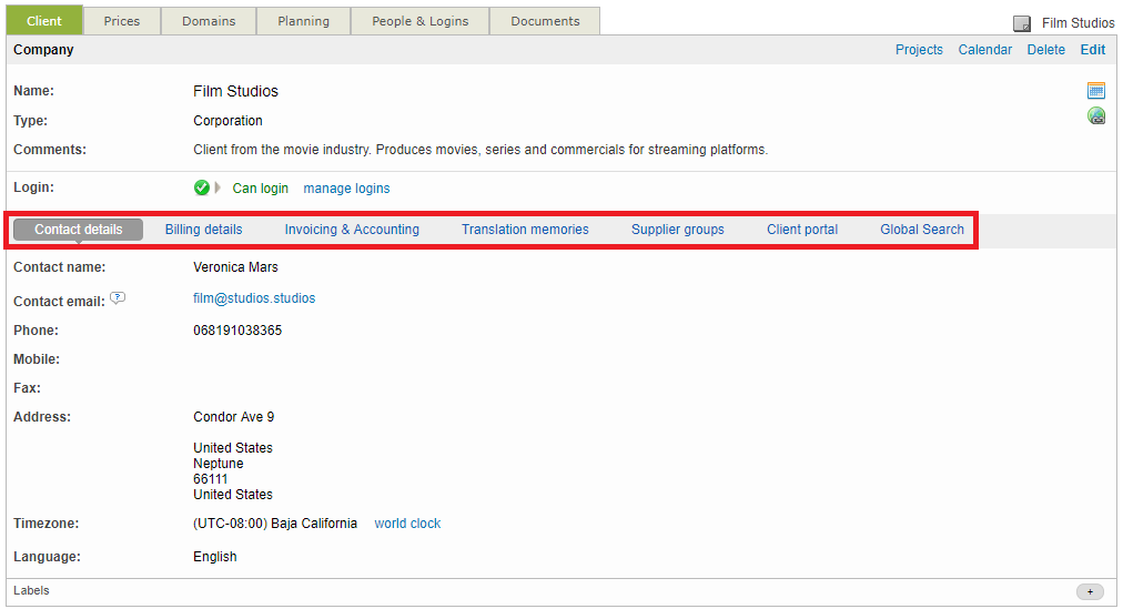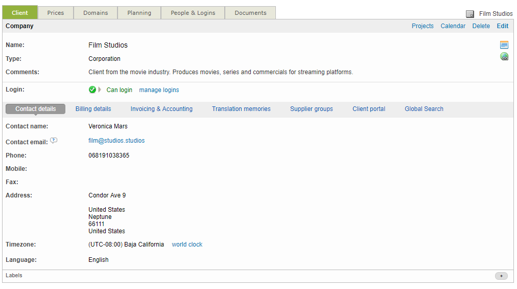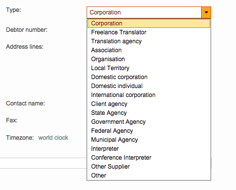 Additionally, you can configure the type of client by using the Type drop-down menu. The client types is helpful in identifying the client in the system and can be configured as a corporation, translation agency, freelance translator, etc. Each is noted in the client screen by a specific icon.