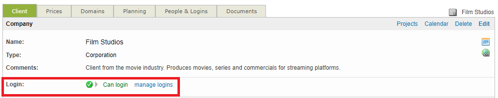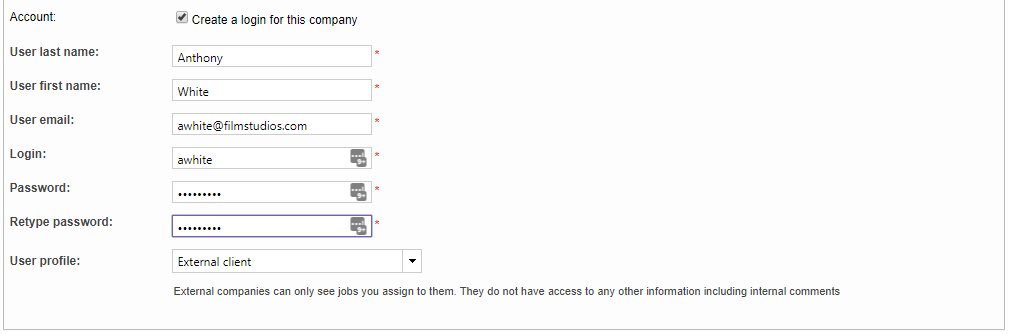 If you have the client portal, then a login can also be created for the client when they are entered into the system. A login is not required and does not apply if you are not using the client portal. To create a login, tick the checkbox next to Create a login for this company and then fill in the required information. This includes: