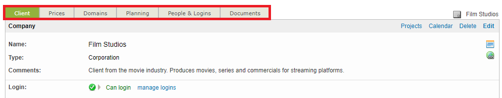 After the client has been added, you will be able to view the client's information and make changes as needed. Six tabs reside at the top: