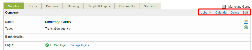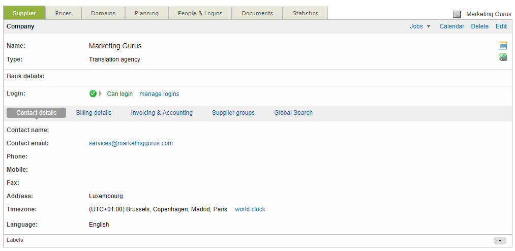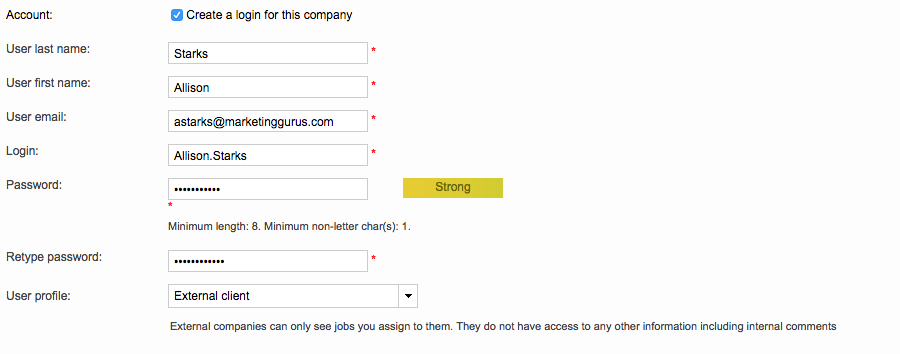 If you need your vendors to get your job proposals in their portal and perform jobs in the CAT environment, then a login will be needed to log into the system and access the Translation Editor. A login is not required if managers are exporting the jobs from the system and dispatching them outside the system. To create a login, tick the checkbox next to Create a login for this company and then fill in the required information. This includes: