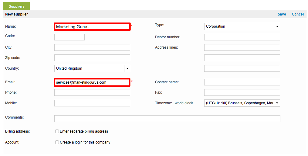 After clicking on New Supplier, you will be presented with an entry form. Only the items with an asterisk are required; however, the more you enter into the system, the easier the vendor company will be to manage.