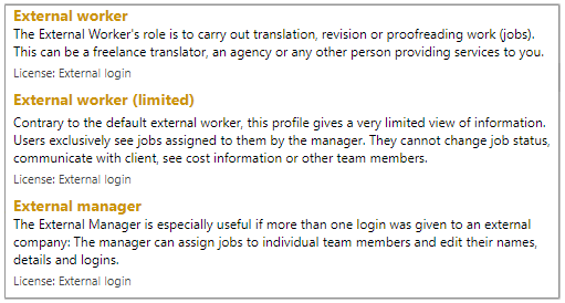 - External Worker - Suitable for those users who need to perform jobs and directly deliver back their work (translations, revisions or proofreading jobs). For example, Freelancers.