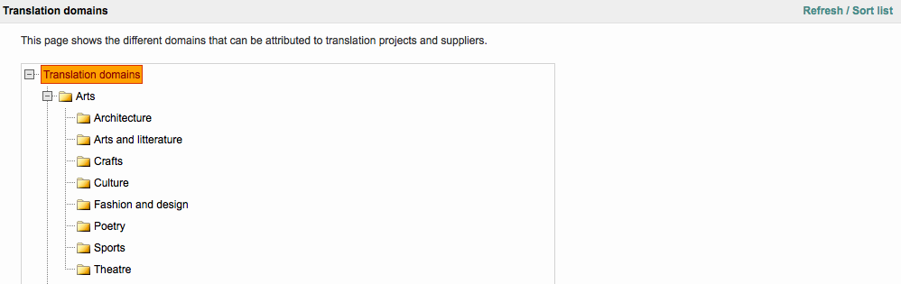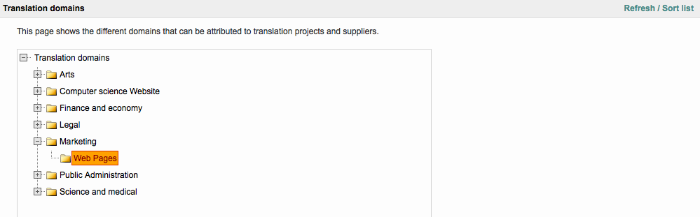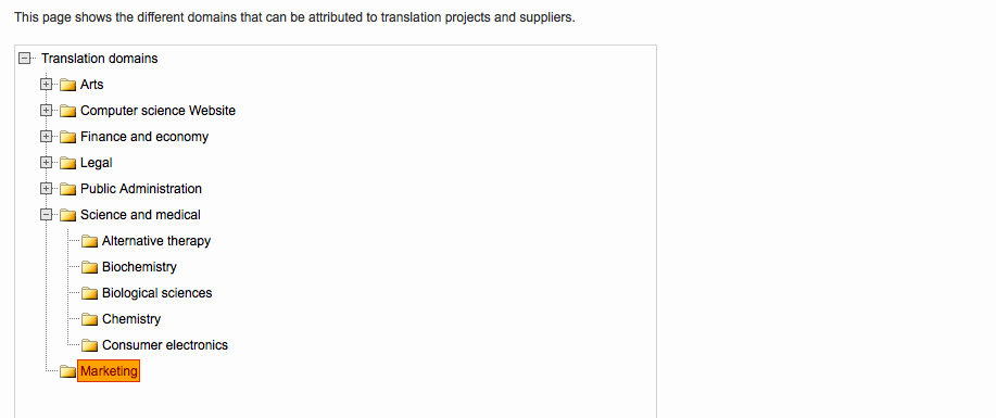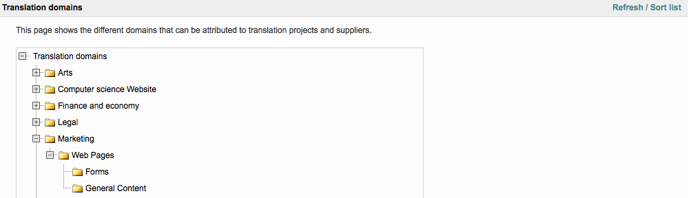 You may add as many subdomains as needed to a parent node. In this example, one subdomain (child node) has been added to the Marketing translation domain: Web Pages. This subdomain has two additional child nodes: Forms and General Content.