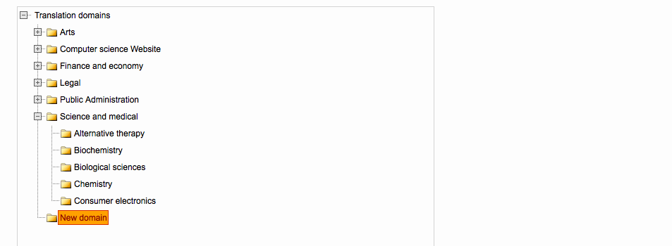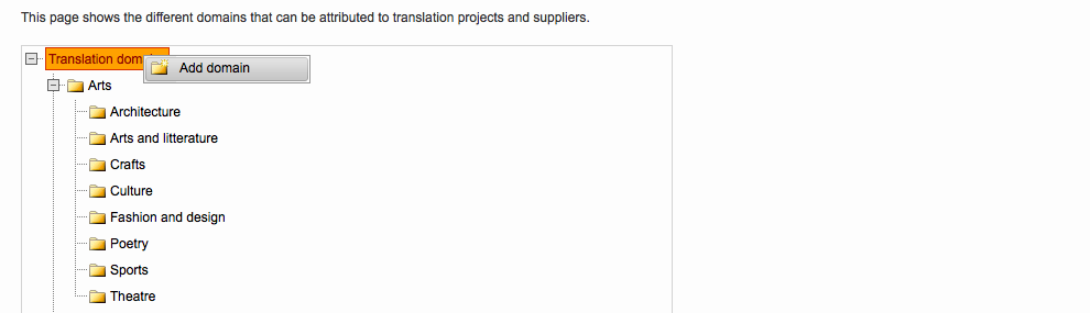 At the top of tree, you will see Translation Domains. By right clicking on this specific node, you will be able to add a new primary domain like Arts as displayed below: