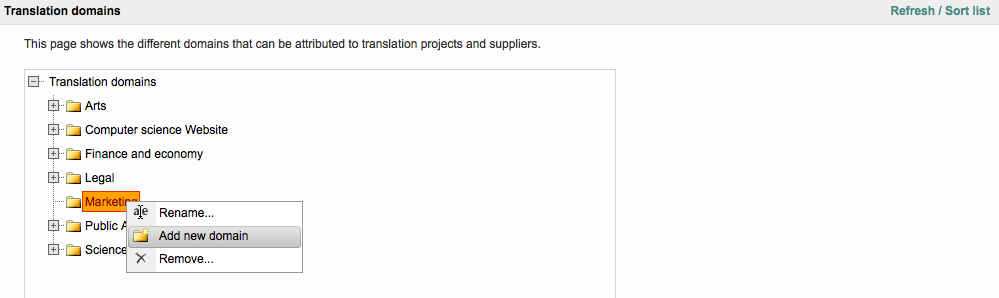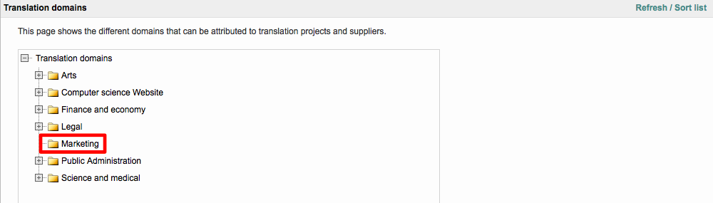 Once the list has been refreshed, the new parent domain will appear within the tree in alphabetical order. For this example, Marketing resides underneath the Legal Translation Domain node.