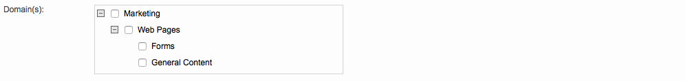 Scroll down to the Requirements Section and you will see the Domains option. As shown below, the Marketing translation domain is now a selection along with the additional child nodes (subdomains) that were added above.