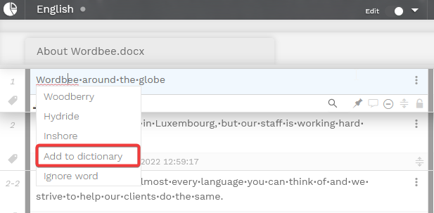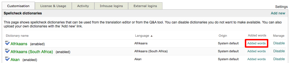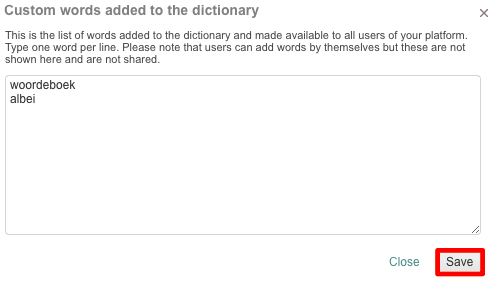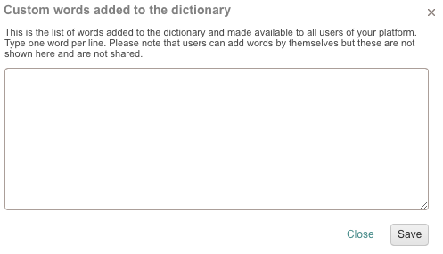 Words added within the settings page are made available to all users of the platform. Users may also add their own custom words from the Editor; however, these are not shared with other users and will not be displayed on the screen above.