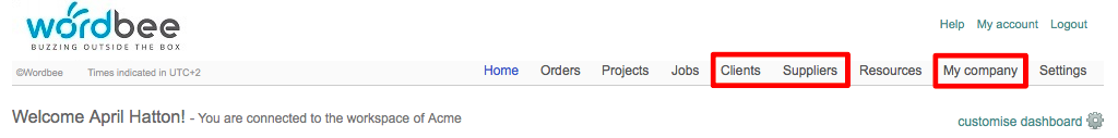 To assign a standard or custom profile to an existing user, first click on the appropriate selection within the main screen: Clients, Suppliers, or My company (Inhouse). This should be where the user has been added.