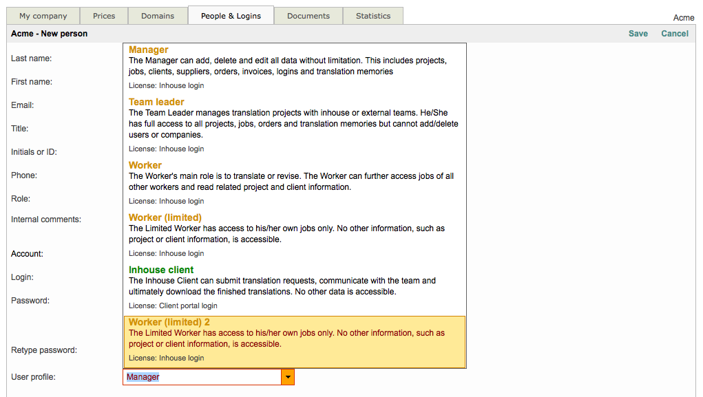 Wordbee Translator provides the ability to assign a user profile when creating a new login account. To create a new user and assign a standard or custom profile, click on Add New in the upper right corner of the People & Logins Tab for an inhouse, supplier, or client users. In these examples, we will be creating and modifying an inhouse user account.