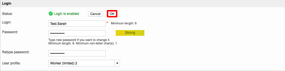Select the profile you want to assign (in this case Worker (limited) 2) and then click on OK to save the change.