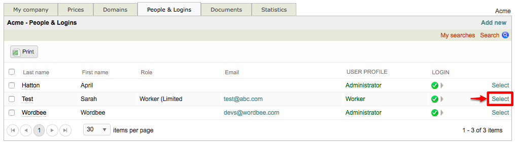 Click on Select on the right side of the People & Logins Tab for the user you would like to modify: