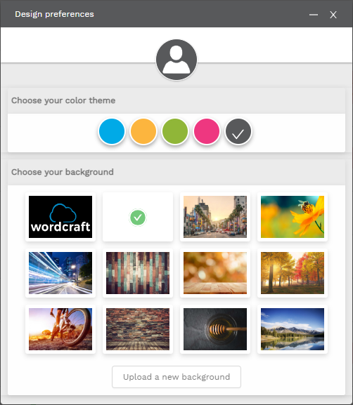 The Design Preferences menu allows users to set their profile picture, select a color theme for the editor, and change the background of the translation editor. To do so, simply click on the existing profile picture and change the color theme and background. In order to upload their own background, users may simply click the button “Upload a new background”.