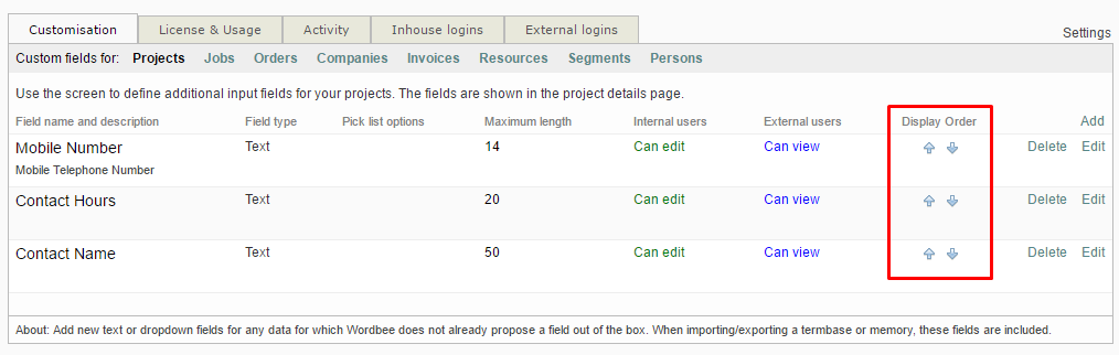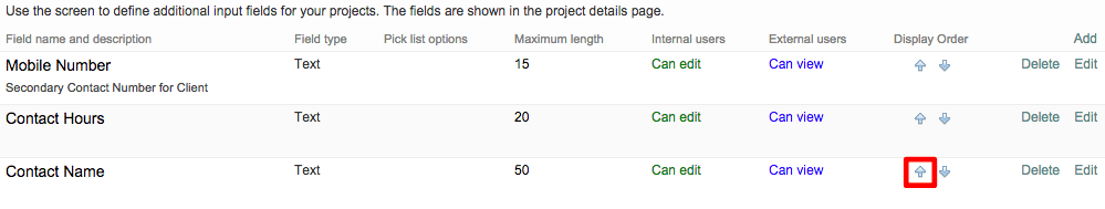 To do so, you will need to access the custom fields settings by going to Settings > General Settings > Custom Fields and clicking on Configure. Then click on the location of the custom field (in this case Projects). Then use the Up and Down arrows underneath the Display Order column to change the position of these items