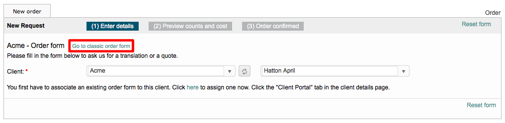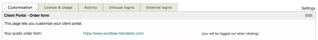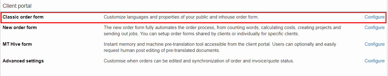 The classic order form is used for public and inhouse orders. By accessing the settings you are able to perform tasks such as selecting specific source and target languages to appear as selection options on the form, entering a URL for the client to accept your terms and conditions, and much more.